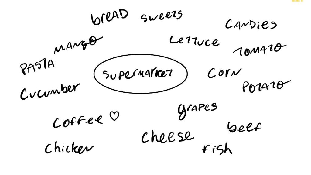 One of the students mentioned she went to the supermarket to buy some fruit and vegetables and some chicken for dinner. I asked the other student “What do you always buy when you go to the supermarket?” and we worked on some emergent language. I elicited some items we can buy in the supermarket and drew a small mindmap with some words they provided and others they asked me to translate.